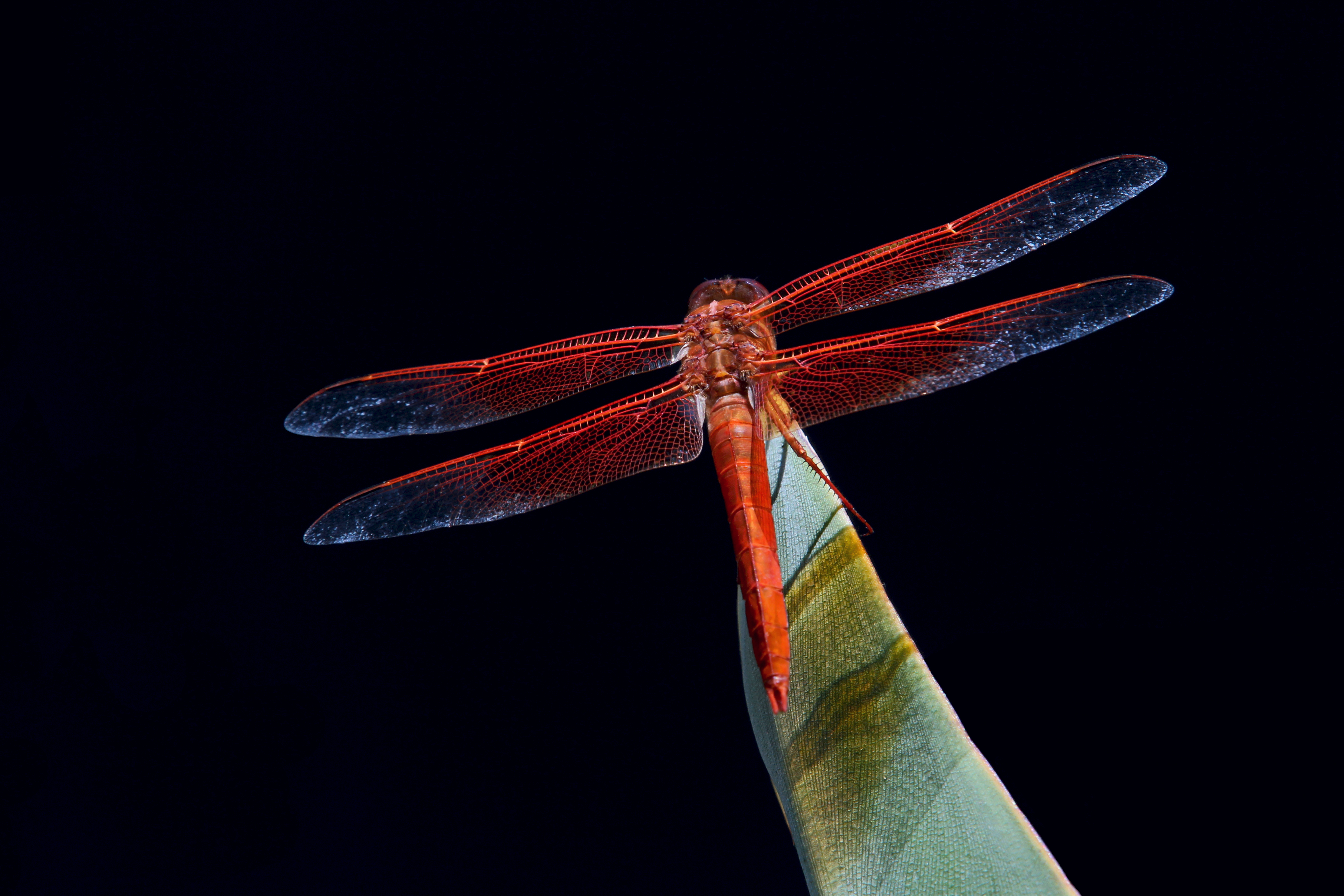 Most of the time, I work in black and white. For me, color can be a distraction and with black and white, a subject is reduced to its essence, to its light and shadows. This subject, however, demanded to be seen in all its resplended hues. Yesterday, this dragonfly landed on a leaf of our bird of paradise outside a living room window. He stayed there, clinging to its perch as the wind swayed the leaf back and forth in the strong afternoon light. During lulls in the breeze, I reached for my telephoto lens and took some shots. With the dark background, this already brilliantly colored being seemed to pop off the screen. The color feels extravagant, almost painful, even after I reduced some of the saturation. There’s an impulse to shade my eyes against this radiant red. Still, what a glittering, beautiful jewel…..
